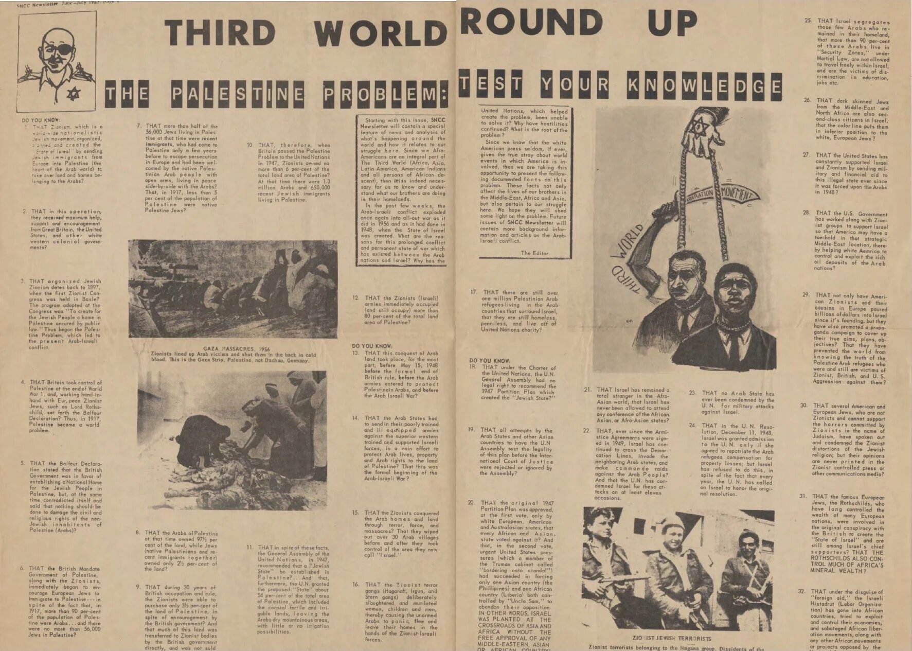 In 1967, the Student Non-Violent Coordinating Committee (SNCC) ran a newsletter entitled Third World Roundup: The Palestinian Problem: Test Your Knowledge, in which it listed 32 factual claims about the history of colonialism in Palestine and the impact of Israeli aggression against the Palestinians during the 1967 Arab-Israeli war.