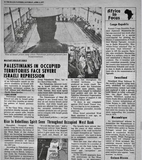 The Black Panther Intercommunal News Service would run very extensive reports on the situation in Palestine. The feature above published in 1977 discusses the repression Palestinians face in the West Bank. The BPP's reports on Palestine shed light on the Palestinian plight and also connected the Palestinian struggle to the Black struggle for freedom in the USA. (The Black Panther, 1977)