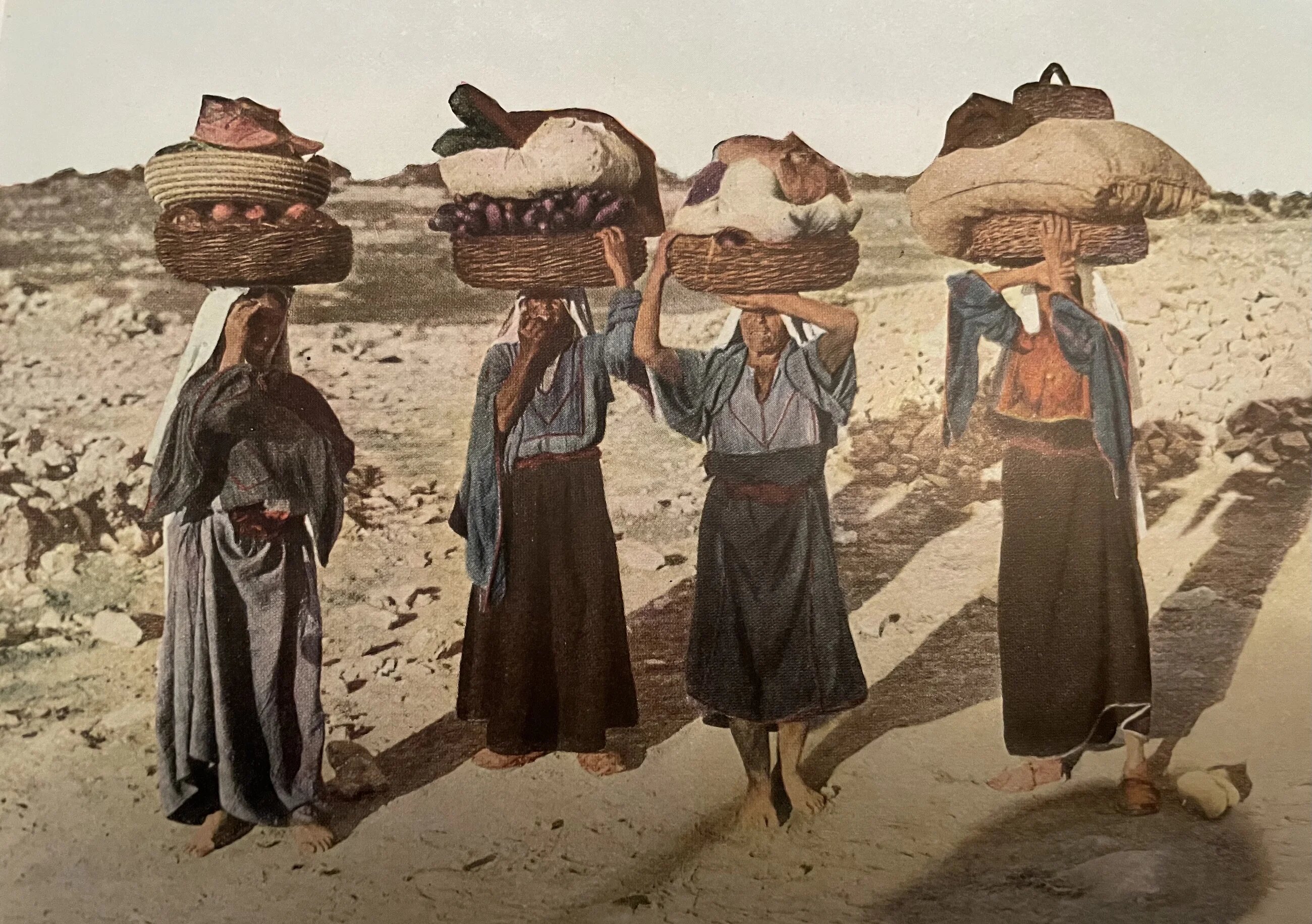 Fellah women were the backbone of Palestinian society, contributing widely to land cultivation and the Palestinian economy, and serving as pillars in the development of Palestinian culture and national identity. As seen through this photograph taken some time between 1889 and 1914, the rural women of Palestine would often travel long distances to sell their farming goods and handcrafts in marketplaces throughout Palestine. Palestinian women were heavily involved in protests against British colonisation and played active roles in politics following the Buraq Uprising of 1929 and during the Arab Revolt of 1933. (National Geographic Magazine)