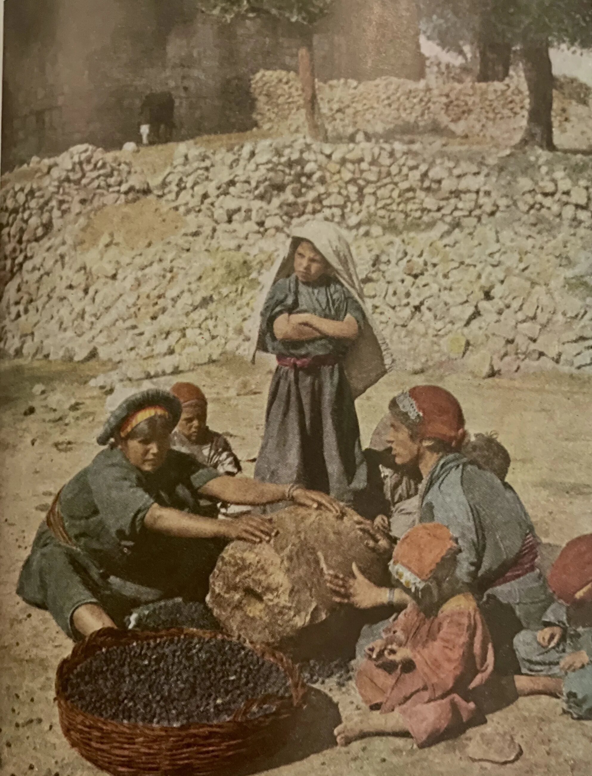 Palestine is considered to be the native home of the olive tree, and for centuries olives have been a centrepiece of Palestinian culture and traditions. In this photo, taken some time between 1890 and 1914, Palestinian women are seen using an ancient column as a roller to produce olive oil, by crushing the olives. Olive harvesting season typically commences in October or November. Once the olives are picked, they are put to use in a variety of ways by Palestinian farmers. The olive tree, like the jaffa orange, is a symbol of Palestinian national identity and emblematic of the connection Palestinians hold to their land. (National Geographic Magazine)