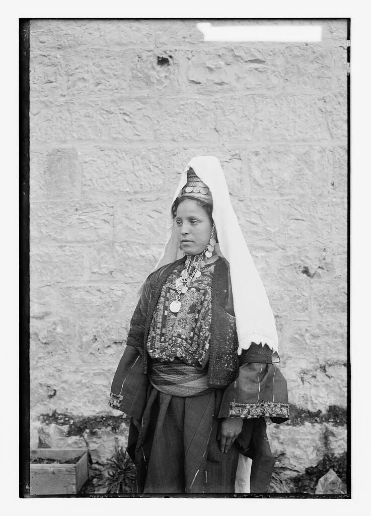 In the early 20th century, the Bethlehem malak (which means "royal" in Arabic) became known as the “queen of dresses” and a sought after wedding outfit throughout Palestine. The malak’s popularity fuelled the growth of a textile industry in Bethlehem and many villages adapted it to fit their own style and customs. In this photo, a Bethlehemite woman wears traditional clothes adorned with a headdress customary of her town - a fez-like hat appended with coins from the woman’s dowry and a white shawl covering her head. (Library of Congress)