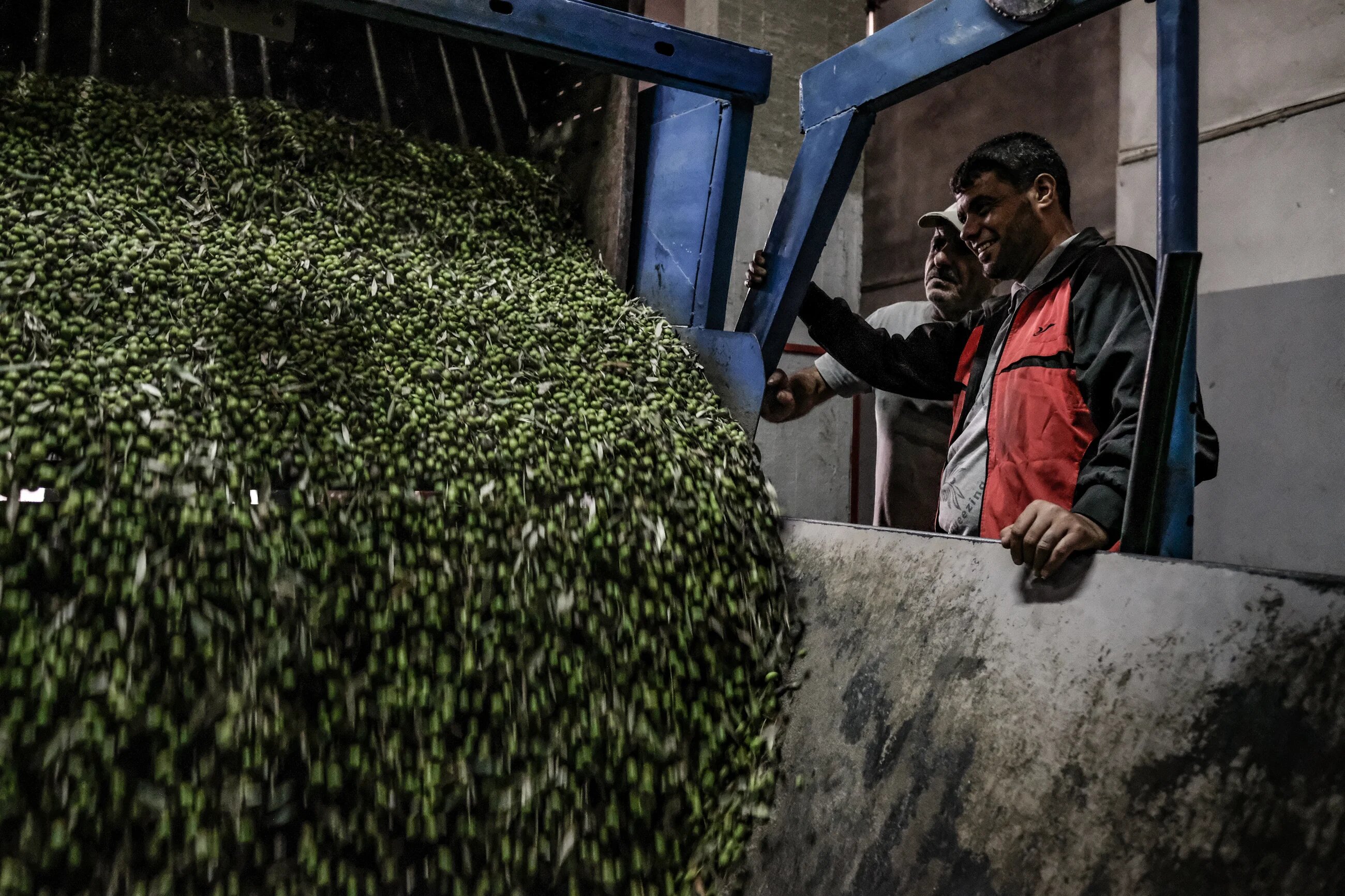 After olive harvesting is completed, a portion of it is distributed to markets and the other part is sent to factories to start the oil-extraction stage. This begins with separating the olives from the leaves and branches, followed by washing and grinding them. (MEE/Fatima Shbair)