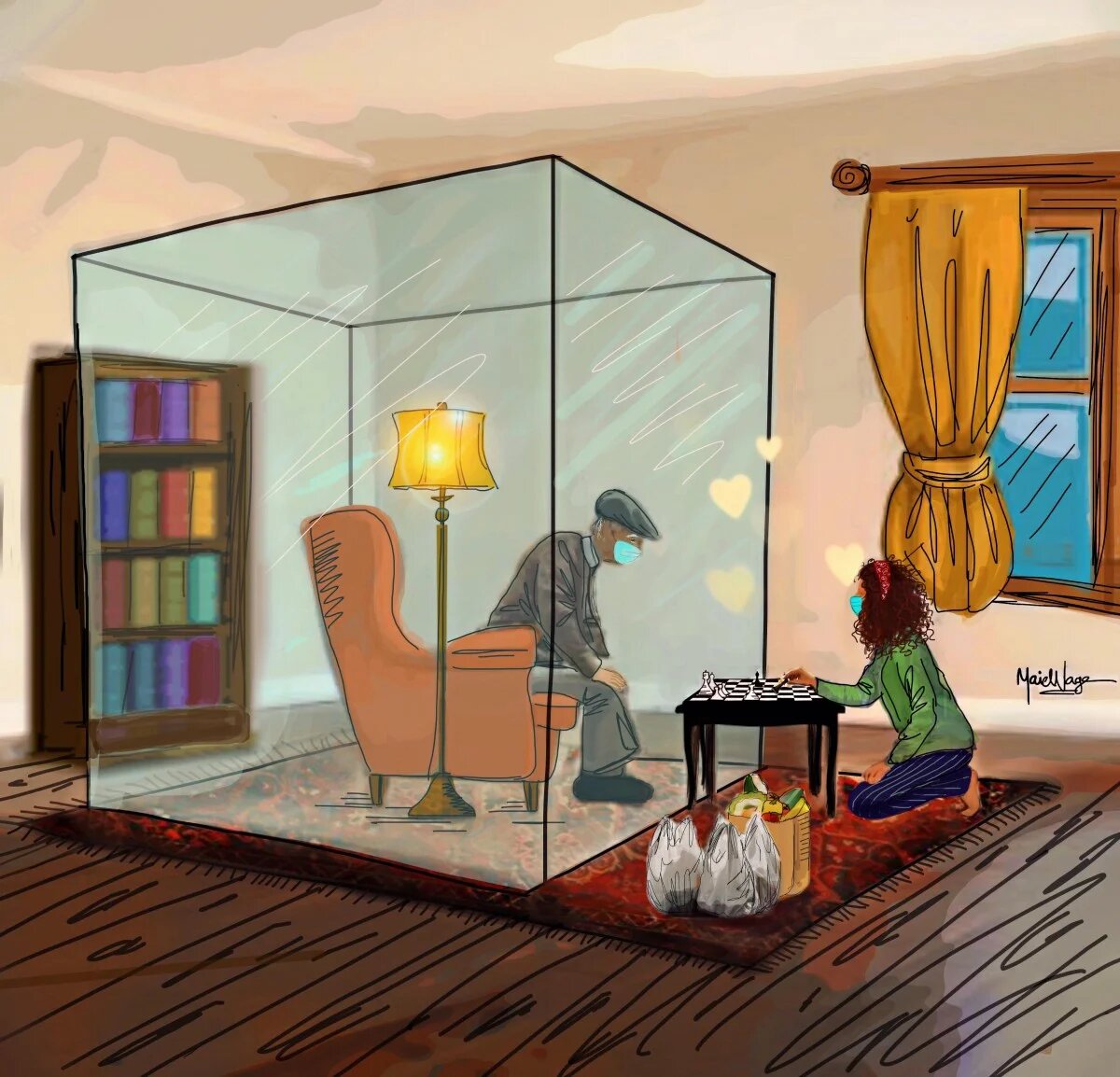 Al-Naga's favourite of her Covid illustrations shows a grandchild playing chess with her grandfather protected by a glass cubicle, expressing the strength of their bond despite the physical barrier dividing them.