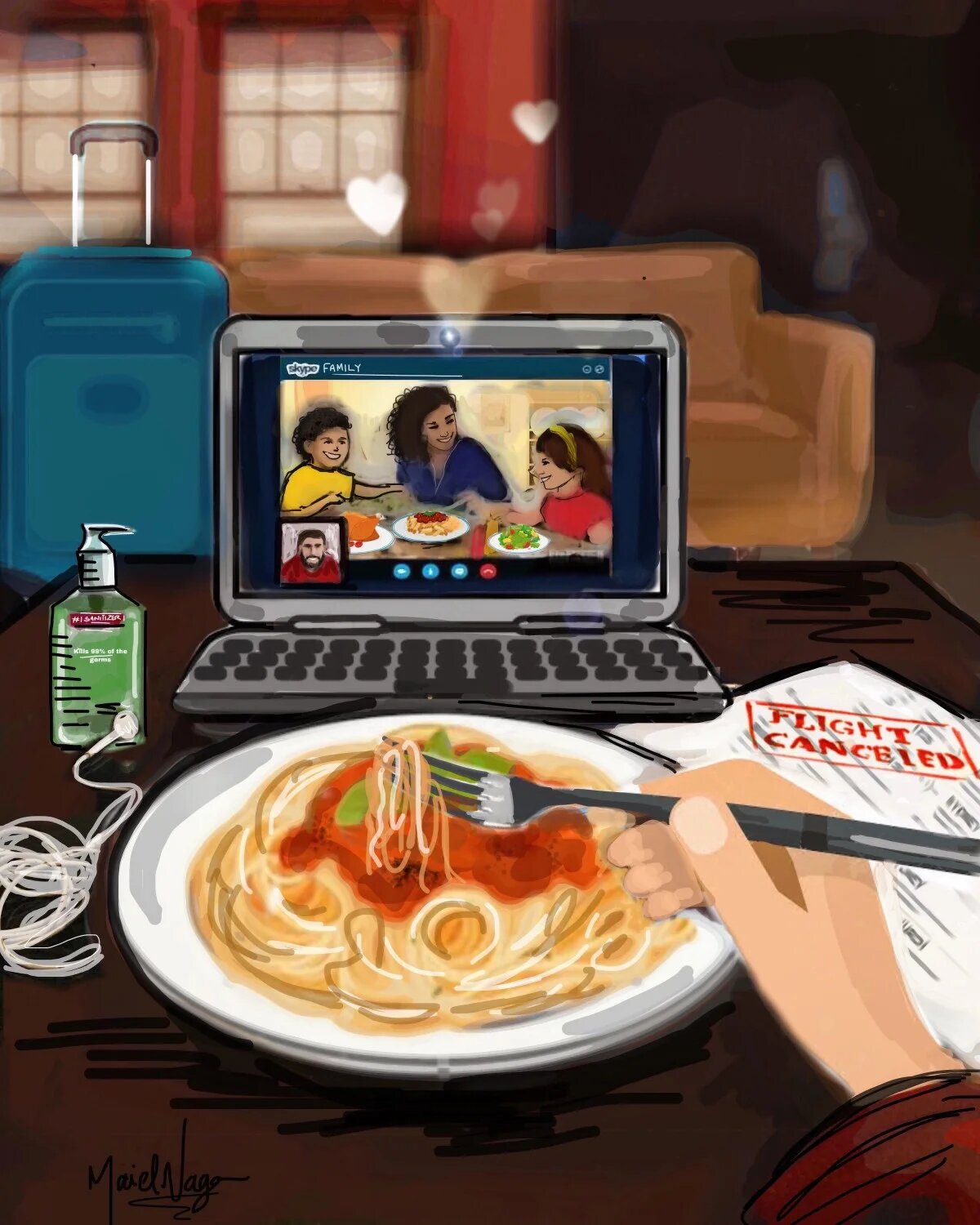 Though her tone is upbeat, al-Naga's illustrations are at times bittersweet. In this image, she recreated a scene where a family separated due to travel restrictions share a virtual meal. "This is a very personal one," says al-Naga, whose father works abroad and has been unable to return as frequently since the start of the pandemic. "It's ten times more difficult for him to come. And there's always the risk of not being able to return."