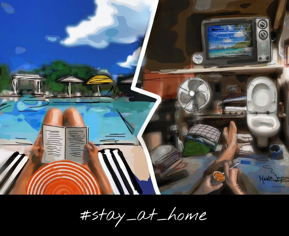 One theme prevalent in al-Naga's art is that of class divisions, which is reflected in this Covid illustration that was inspired by the Oscar-winning South Korean movie Parasite, which spotlights the disparity between the country's rich and poor. "I felt it was also very relevant to what was going on at the time, because I would see a lot of people complaining on Facebook about how they want to get out of the house and so on," she says.