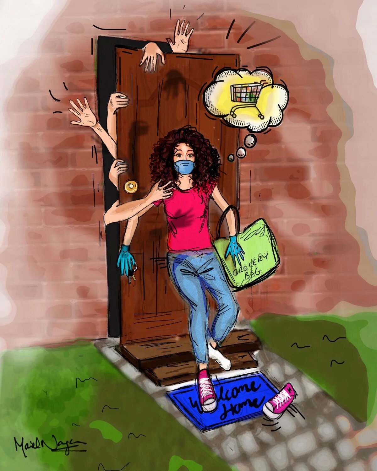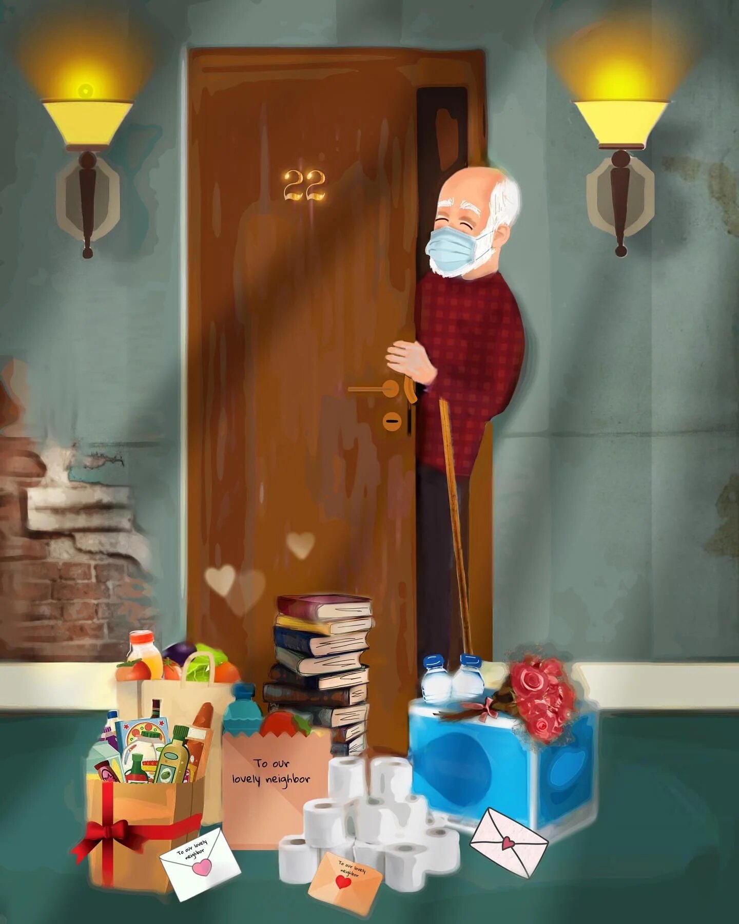 And there were some positives to be noted, like small acts of kindness performed around the world. In a set of separate Covid-inspired illustrations, al-Naga documents the ways in which neighbours reached out to help one another by buying groceries for those most vulnerable.