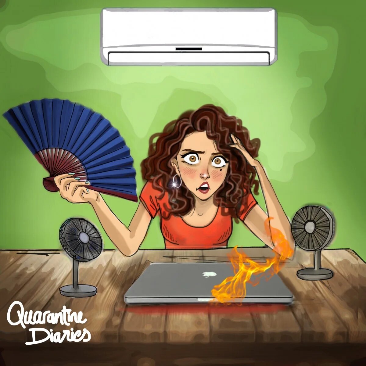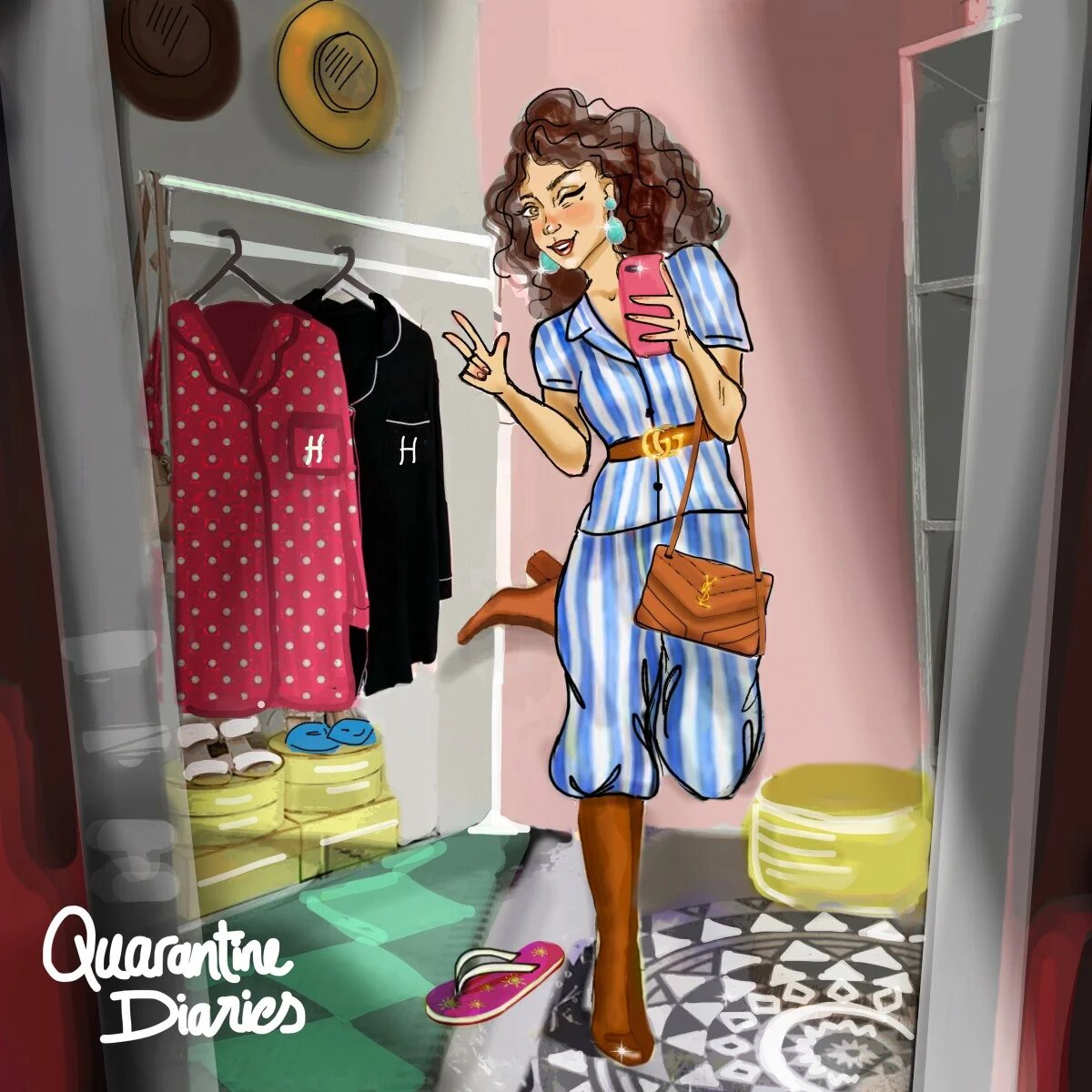 "I really wanted to create artwork that reflected on the time and I felt like a web comic is the ideal thing, creating a character that people could see and different scenarios would be more interesting than just having different artworks," says al-Naga. Hoor is seen here styling her pyjamas to reflect the rising popularity of night- and lounge-wear since more people started studying and working from home.