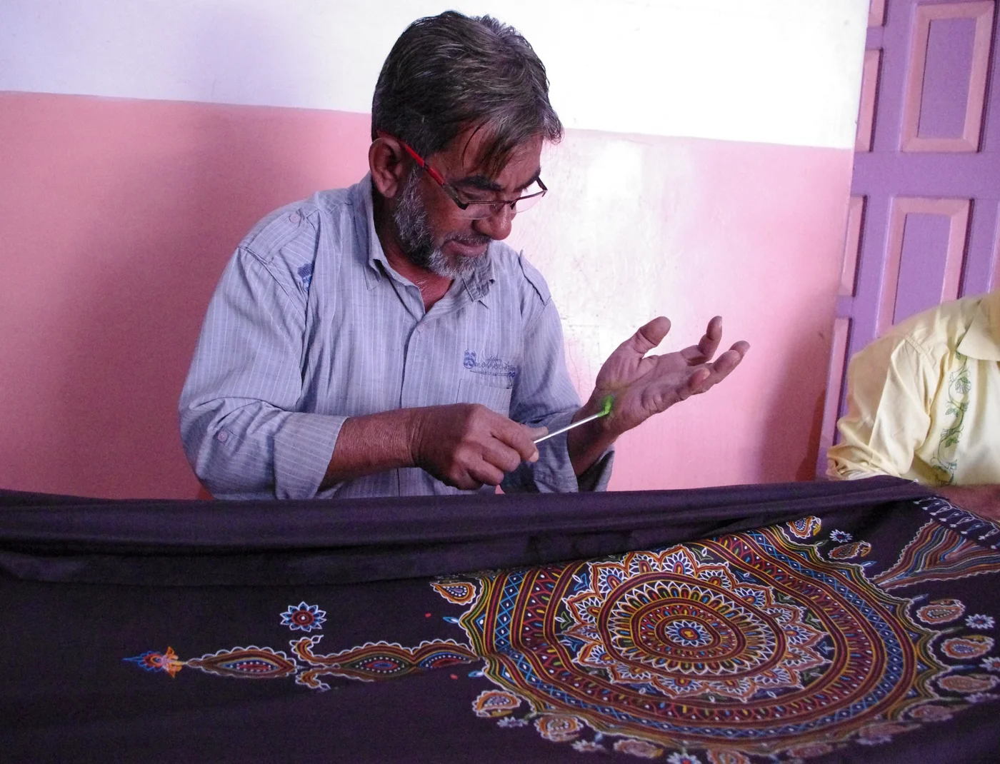 In a small village in western India, members of the Khatri community spend almost every day sitting in their workshop, bent over a piece of cloth, with a needle in one hand and a thick mass of colour on the palm of the other.