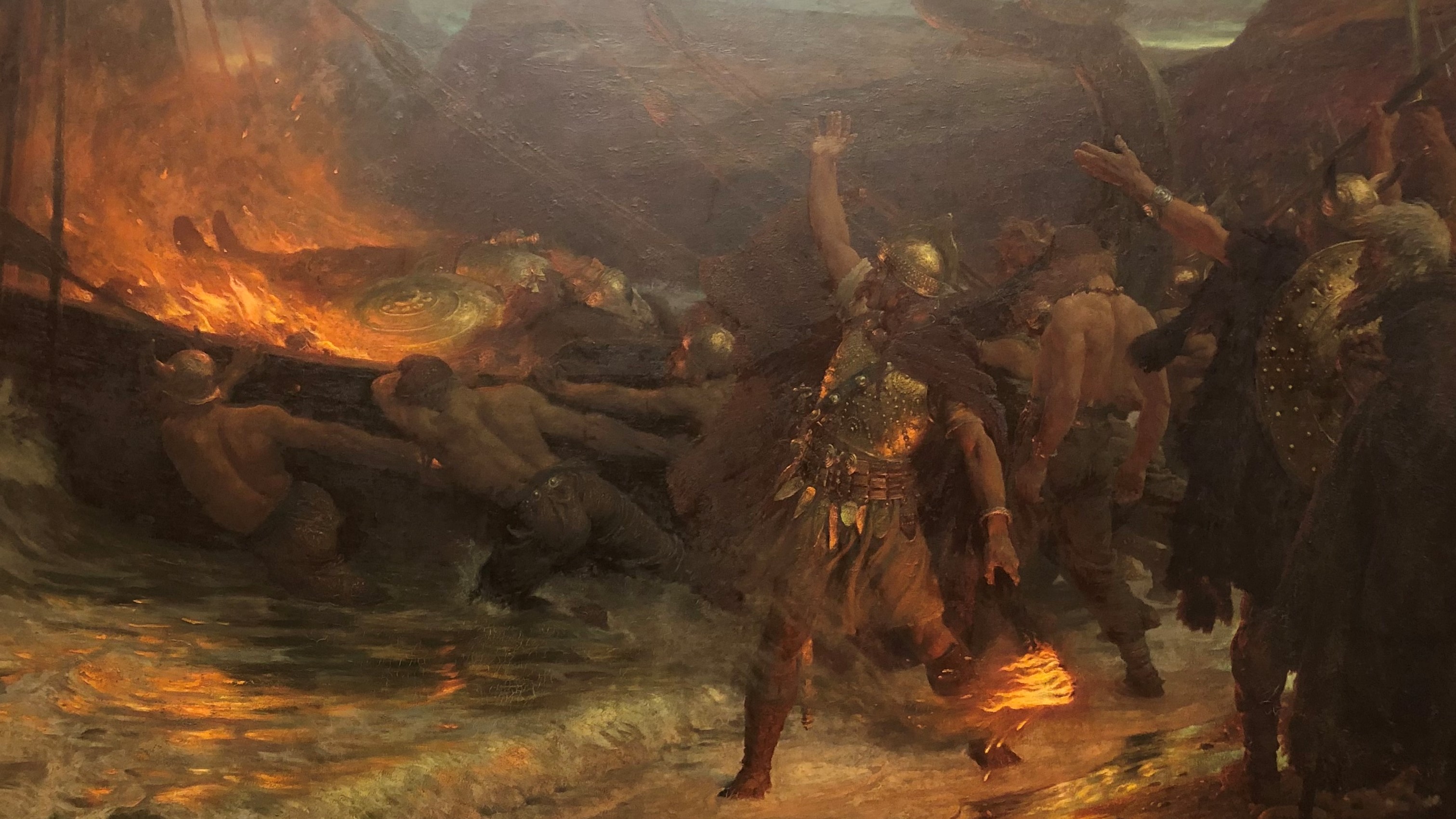 After the sacrifice, the boat is set alight and is consumed by flames helped by "violent and frightening winds".