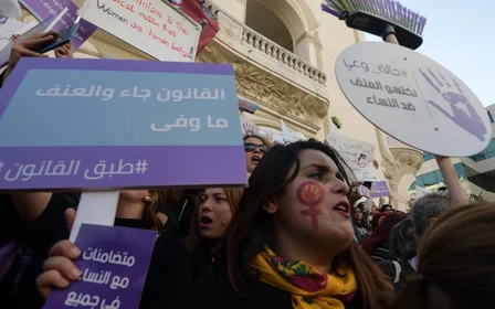 Tunisian feminists call for the release of women arrested for criticising President Kais Saied at a rally in Tunis on 13 August (AFP)