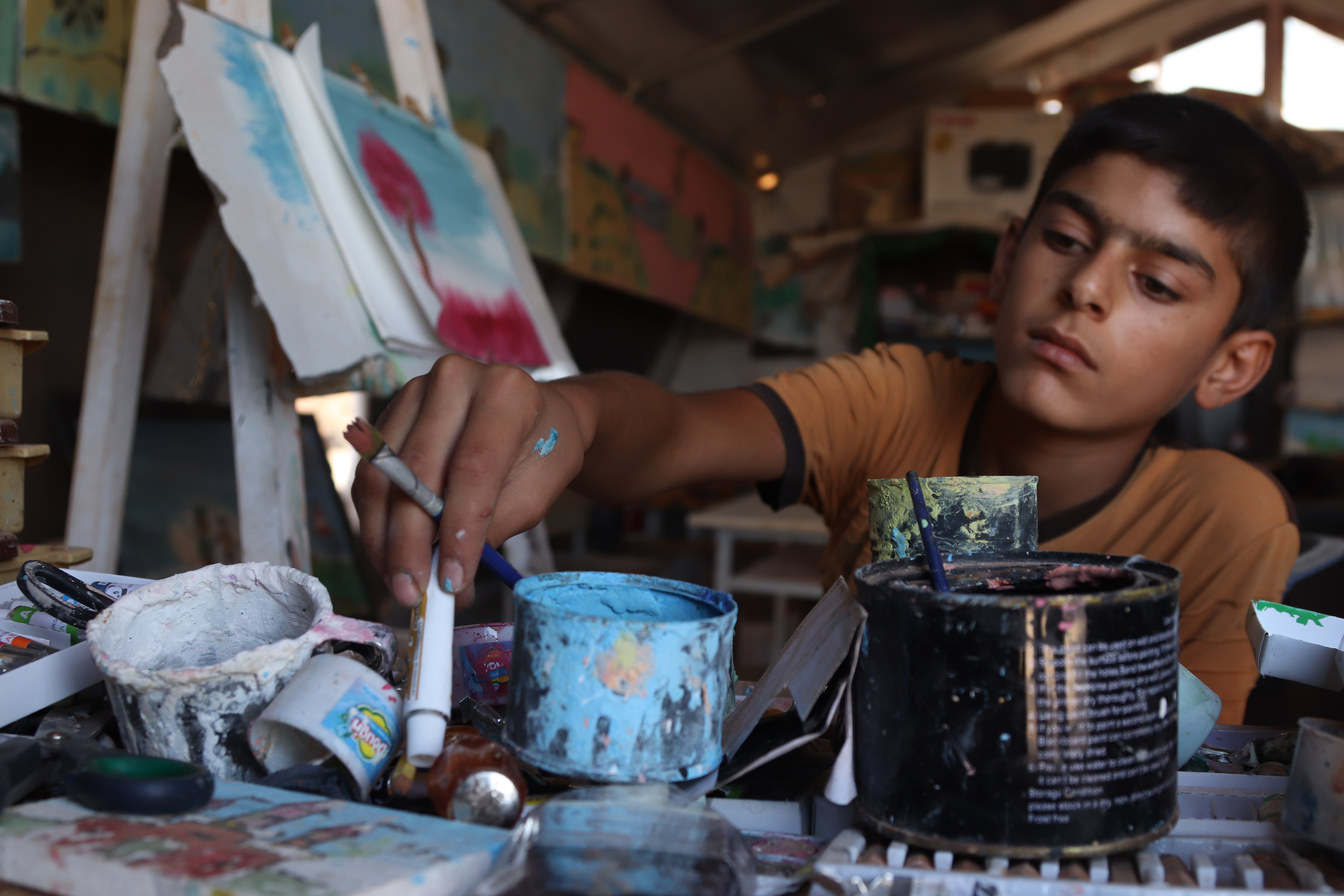 “I had a love for art when I was young but my family didn’t support me,” says Saleh. “When I saw that Usama had the same passion and talent, I wanted to give him my full support.” On weekdays, Usama attends a school outside the camp 7km away in Maarrat Misrin, which he walks to.