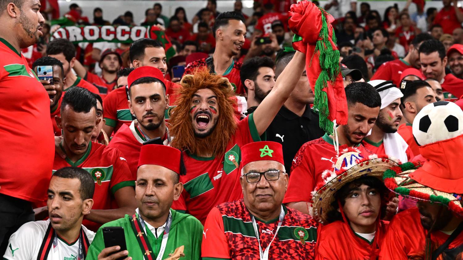 Morocco fans cheer on their side during their final group stage match against Canada on Thursday at Doha's Al Thumama Stadium. The tournament has been marked by widespread displays of pan-Arab unity, as fans from various Arab states get behind one another's teams (AFP)