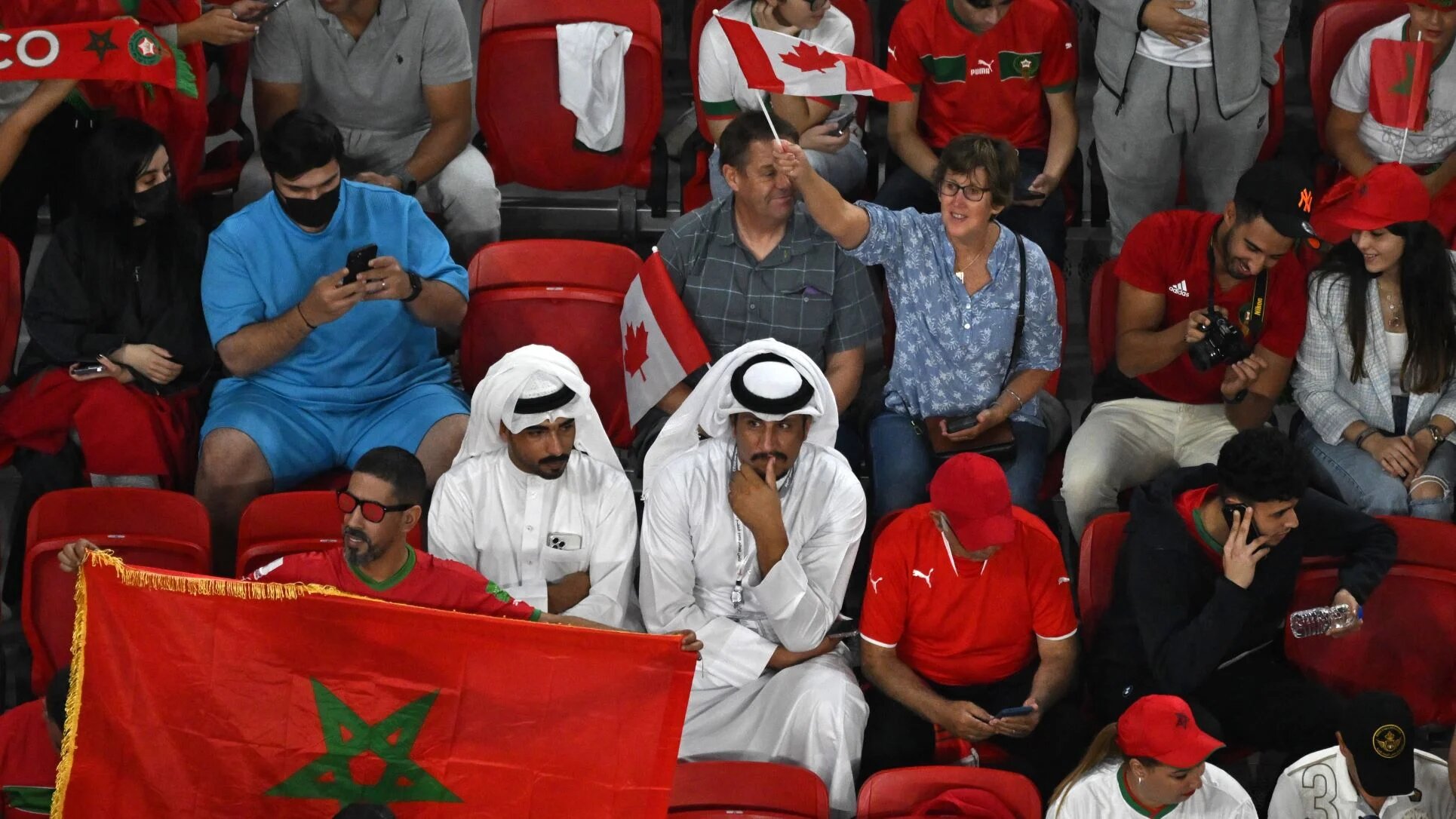 Qatari, Canadian and Moroccan fans mingle inside Al Thumama Stadium as the Moroccan and Canadian teams battle it out in their final group stage fixture (AFP)
