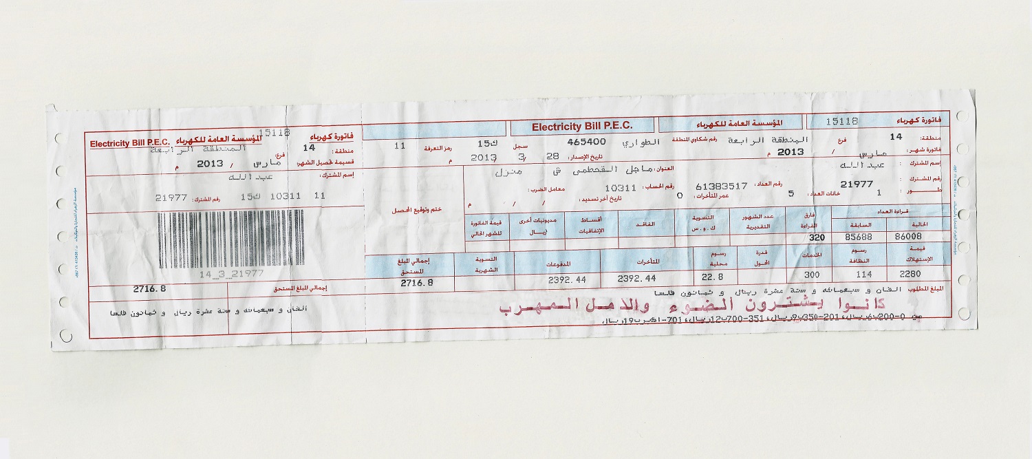 For her project Where We Were When The Lights Went Out, she took utility bills and counter-stamped them with poetic lines in Arabic such as “A moment in the dark does not blind us” or “They purchased light and smuggled hope.” As a work of contemporary art, it is witty and bitterly ironic.