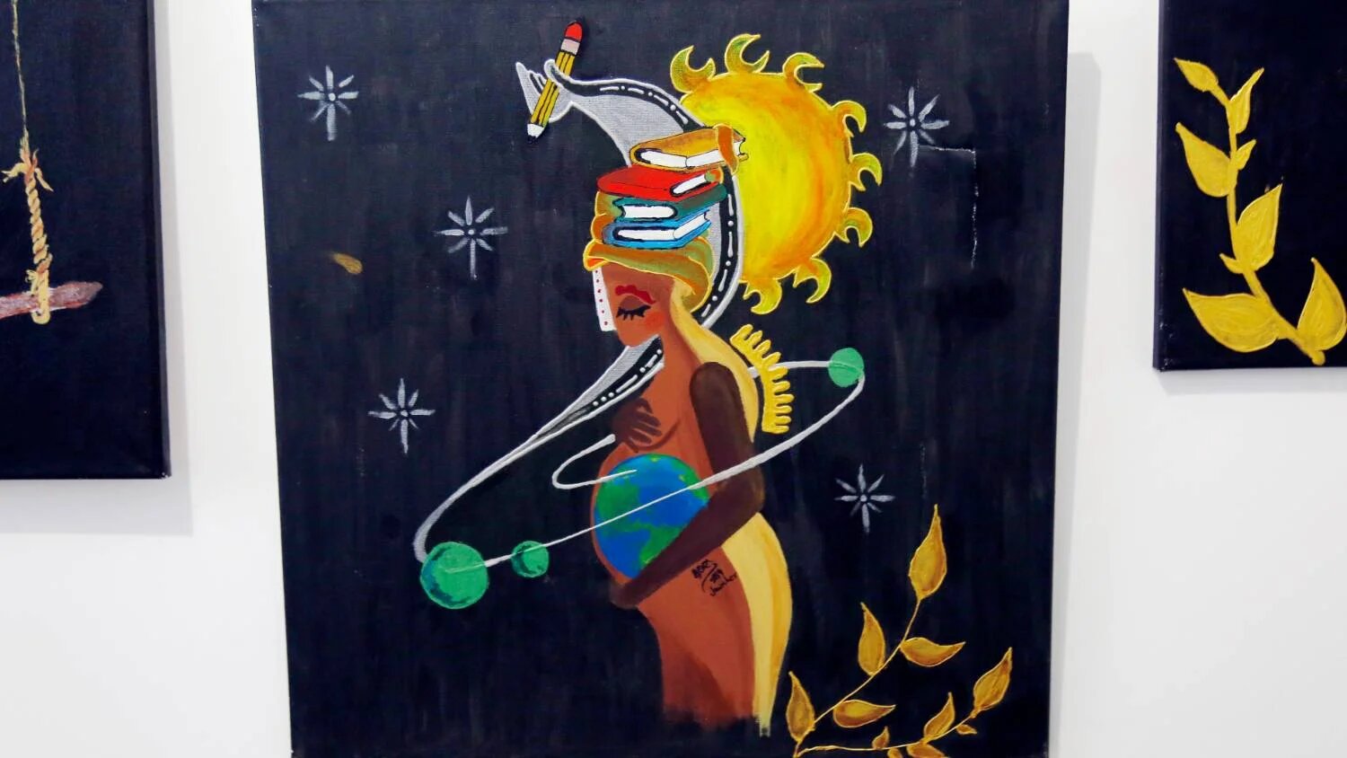 This painting tackles the issue of racism in Yemeni society. The character's body is layered with different shades of skin tone, with the comb curving along the top of her spine representing equality. The symbolism of the comb stems from a tradition attributed to the Prophet Muhammad in which he says that human beings are equal "like the teeth of a comb". The books balancing on the woman's head and the sun shining down represent a woman's ability to reach the pinnacle of success, while the solar system wrapped around the figure's womb symbolises how women are key to educating and raising the next generation.