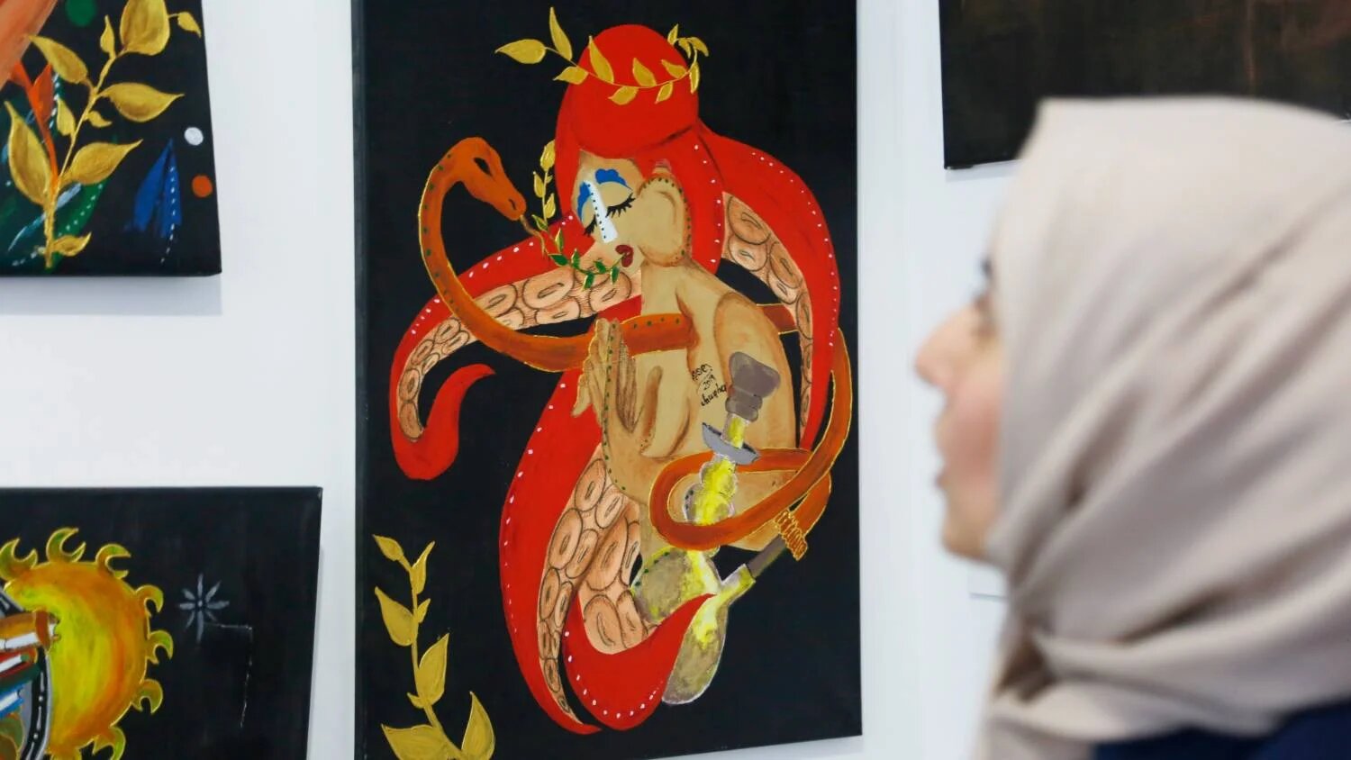 In this image, Mughlis takes aim at the damaging effect of social media. In the painting, hands crowd around the female figure as she looks down forlornly. The arms seem like they are ready to pull down and consume the woman. Mughlis says they represent men who blackmail women after acquiring private photographs or other personal information about them. But the painting also carries in it a note of optimism; the flame-haired woman holds the key to her own freedom. She says: "We can demonstrate our strength on social media sites and show blackmailers that even if they get ahold of private images, they are just pictures and they will not be able to blackmail or control us."