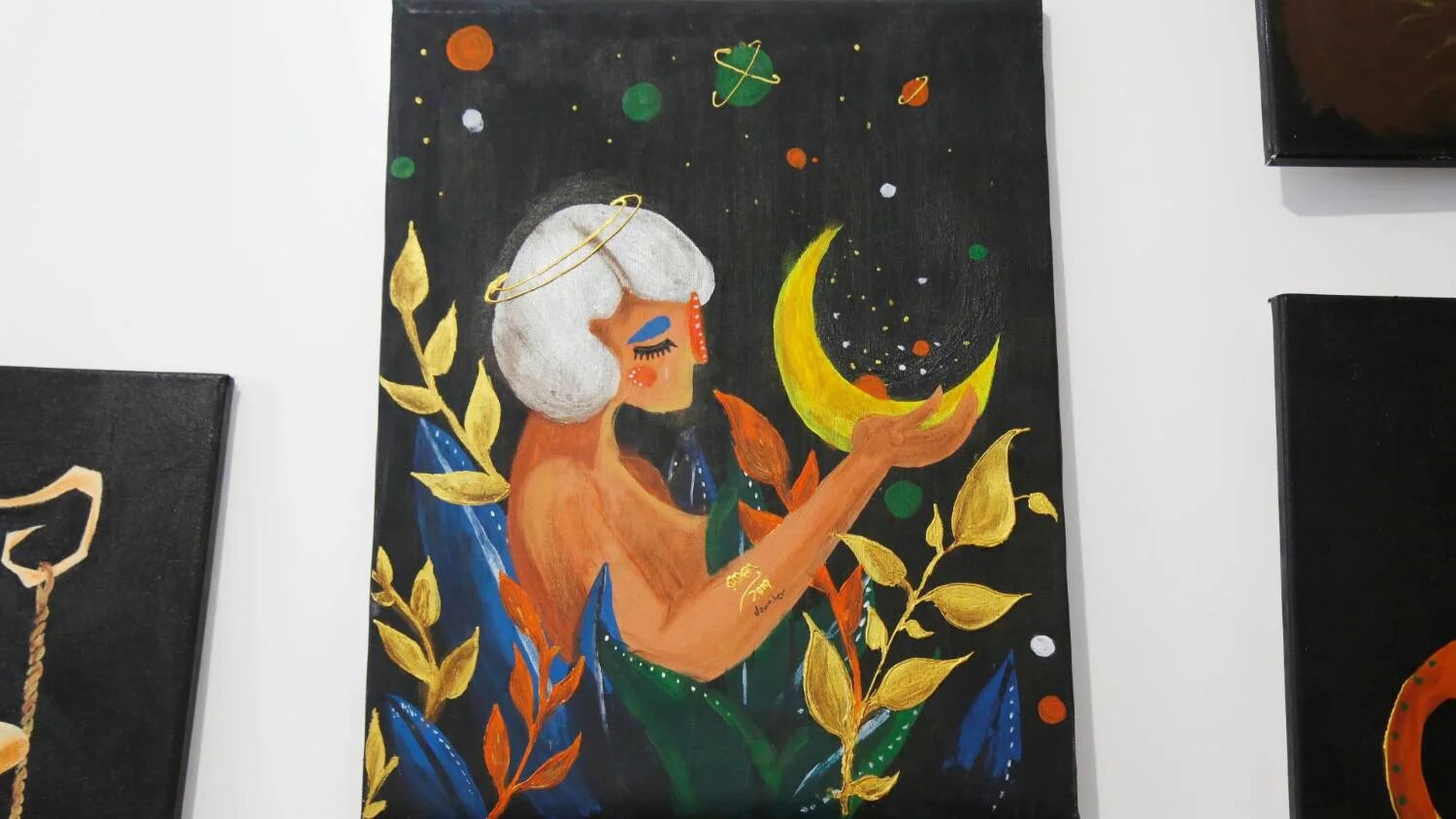 In the painting above, a female figure looks wistfully at a crescent moon she is holding, while sitting on a bed of plants that grow around her. The image simultaneously delivers a message of fatigue and hope.