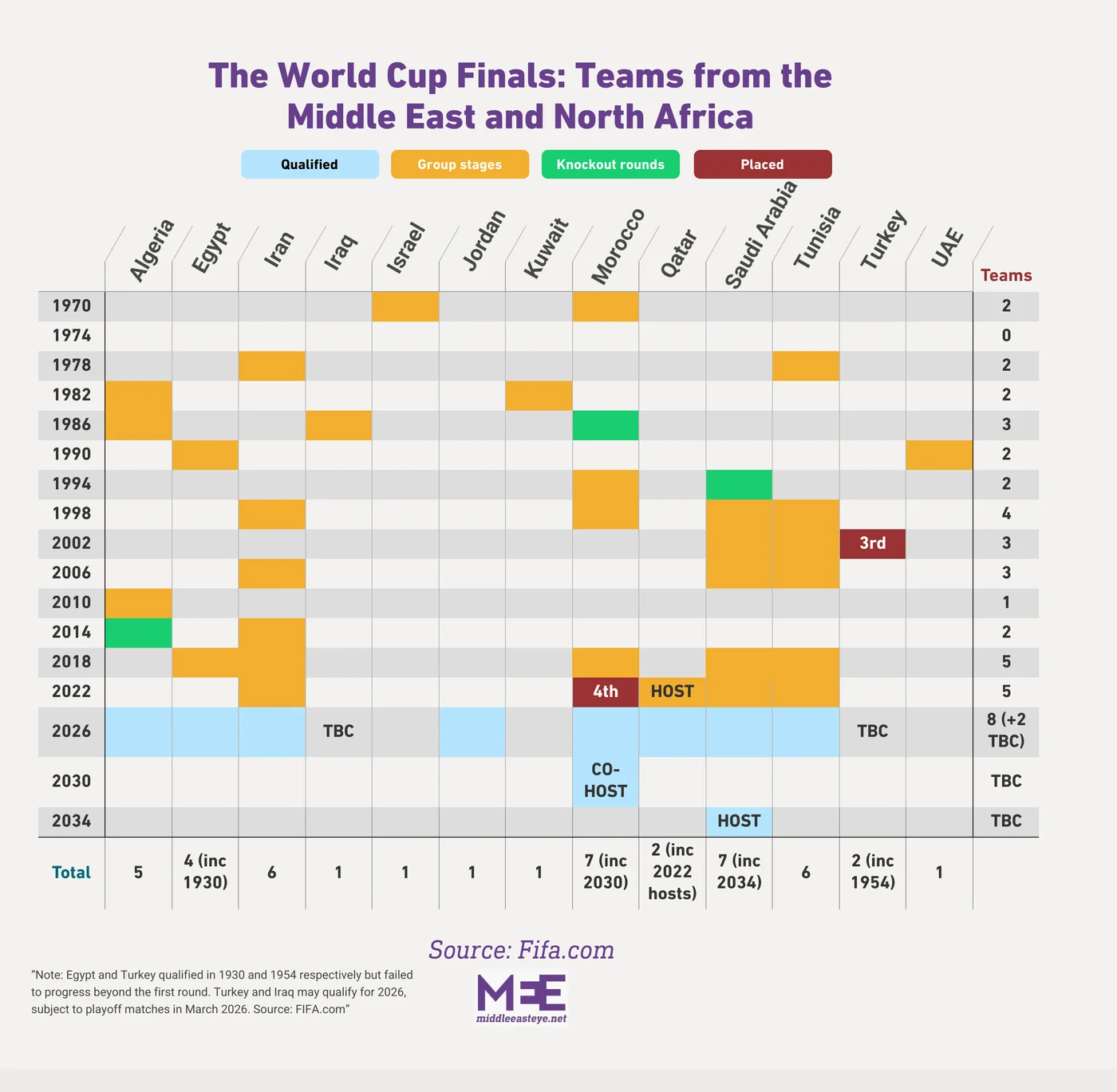 The first team from MENA to compete in the finals was Egypt, in Italy in 1934. Fast-forward 88 years, and five teams from the region appeared in the finals, including hosts Qatar.