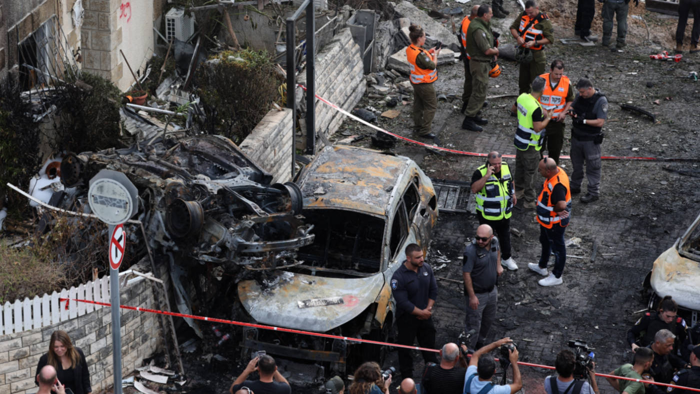 Israeli responders and forces gather amid debris and charred vehicles in Kiryat Bialik, Israel, following a rocket strike by Hezbollah in September 2024 (AFP)