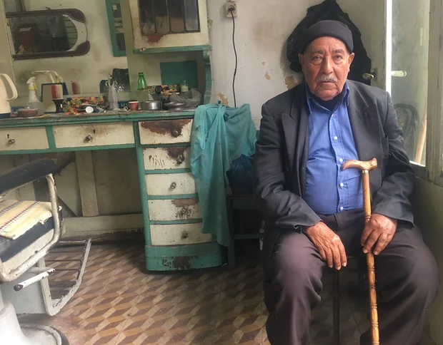 Abu Hani al-Khatib, 83, sitting at his barber shop in the Feras popular market, in central Gaza city (MEE/Maha Hussaini)