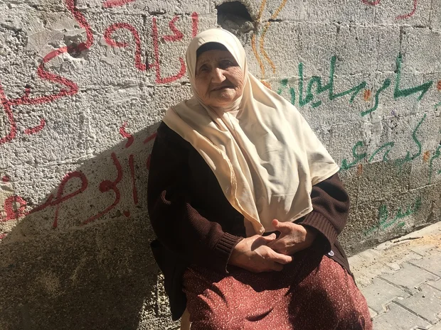 Fadila al-Ashi, 82, sitting on a wooden chair in front of her house in al-Nasr street, southern Gaza city (MEE/Maha Hussaini)