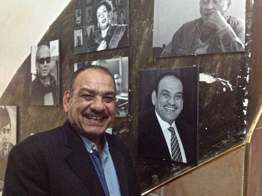 Director of Iraq's National Dance Troupe Fouad Thanoon stands beside his photo on a 'wall of fame' in Baghdad's Karrada district (MEE/Tom Wescott)