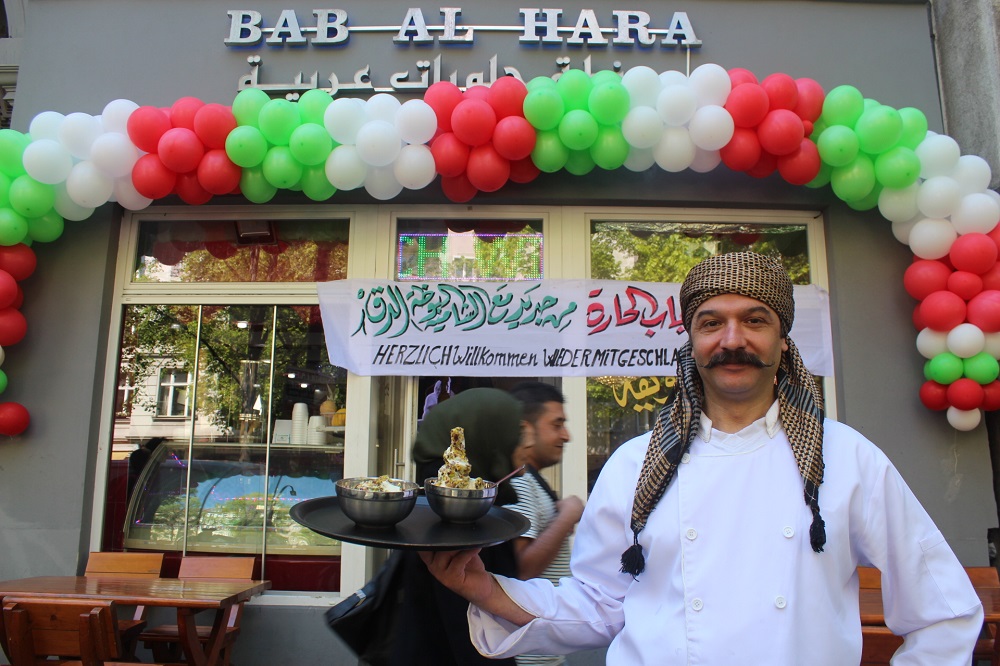 Rafik Almadah, a Syrian who fled to Germany two years ago, has now opened Bab al-Hara ice cream shop where he serves the same whipped ice cream he once served in Damascus. He does so while wearing a keffiyeh around his forehead and sporting a well-designed moustache that is both Arab-looking and hipsterish.