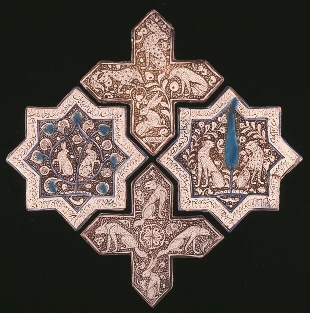 Star and Cross Tiles from Iran is particularly exquisite. Dating from the late-13th century AD, the combination of star and cross tiles exemplifies the symmetry and geometry that has come to define Islamic art.