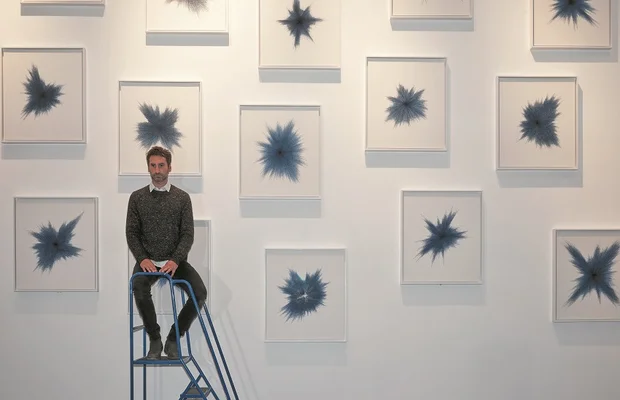 Against the back wall of the gallery is an immense series of works by contemporary British-Pakistani artist Idris Khan. The series, titled 21 Stones, references the ritual that takes place during the Hajj pilgrimage when stones are thrown at pillars to symbolise the Stoning of the Devil. Twenty-one blue canvases line the wall recreating the impact of the stone hitting the pillar.