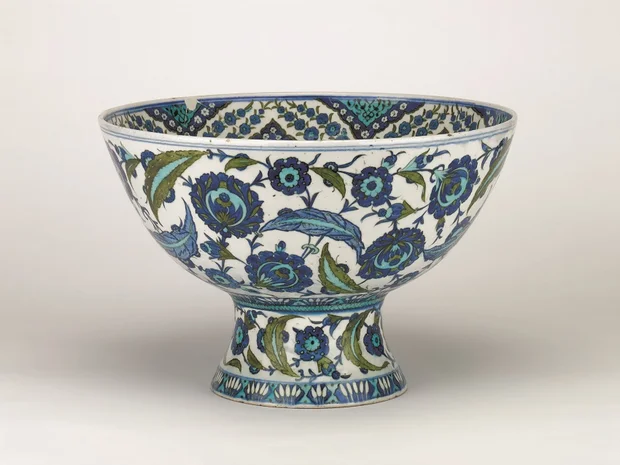 A highlight from the Ottoman dynasty includes the Iznik Basin. Dated to the 16th century, the basin blends the typical Islamic blue found in the earliest architecture of Islam with Chinese floral imagery to create a style unique to the town of Iznik, southeast of Istanbul.