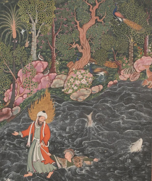 One of the paintings depicts the prophet Elijah, known to Muslims as Ilyas, who is mentioned in both the Bible and in the Quran, saving Nur ad-Dahr, the grandson of Amir Hamza from drowning. Water gushes out of an idyllic landscape of fruitful trees, blossoming flowers and animals, leaving one visitor to remark that it "looks like paradise".