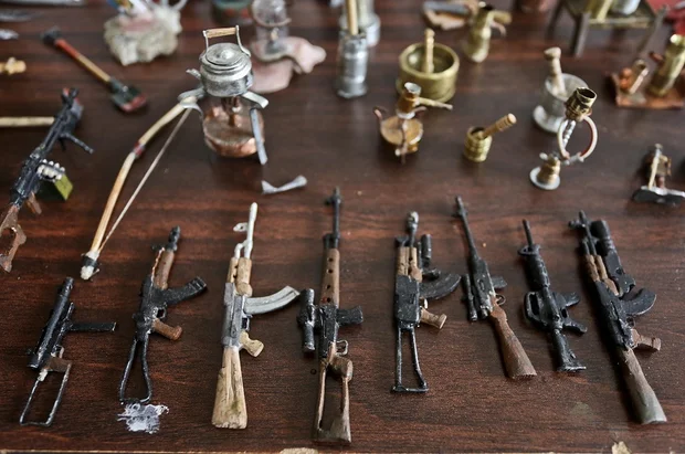 “I transformed these violent weapons into peaceful handmade figurines and miniature installations,” he says.