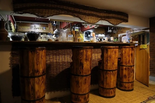 The open design of the restaurant's kitchen allows for clients to be exposed to the cooking process. Old barrels are used as stools surrounding the kitchen's grey marble table where glass jars are filled with an assortment of fresh pickles and herbs. Plastic products are rarely seen in the restaurant.