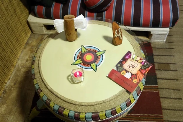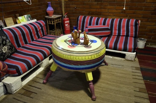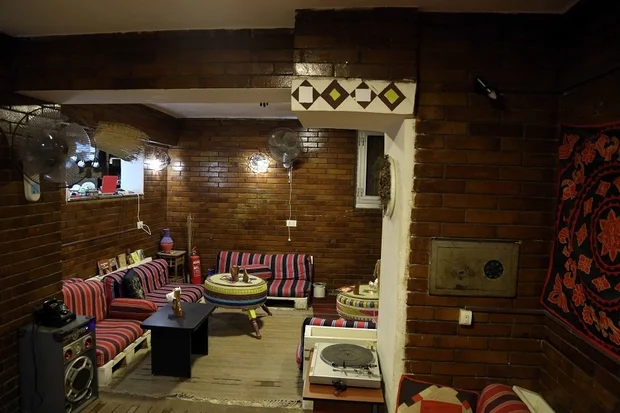 For news producer Amr Ahmed, the restaurant is a "calm haven" where he replenishes his energy while talking to friends. "In the beginning, the restaurant attracted me with its simple design. It's amazing that we are eating on a table made from old car tyres," he said, referring to the yellow, blue and brown table where his coffee sits.