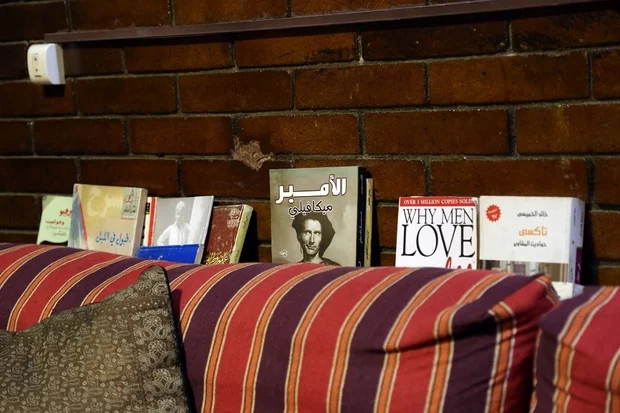 On the left corner of the door, three shelves make a small library with dozens of books on diverse topics. The books are stacked in a way that is meant to encourage clients to grab a book and read. "We want people to read," Bishoy said.