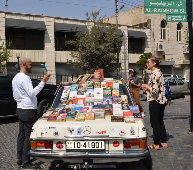 “It’s like a mosaic of books,” says 28-year-old Gaith Bahdousheh, the owner of the car he nicknamed "Nancy". Sitting in front of one of Amman’s famous ice-cream shops, the white Mercedes displays books in many different languages and genres.