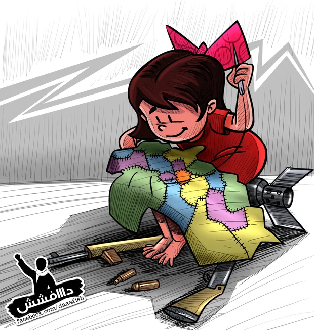 The cartoons are distributed through Daaafish’s Facebook and Twitter accounts, and further shared by a wide network of Iraqi Facebook pages and websites.