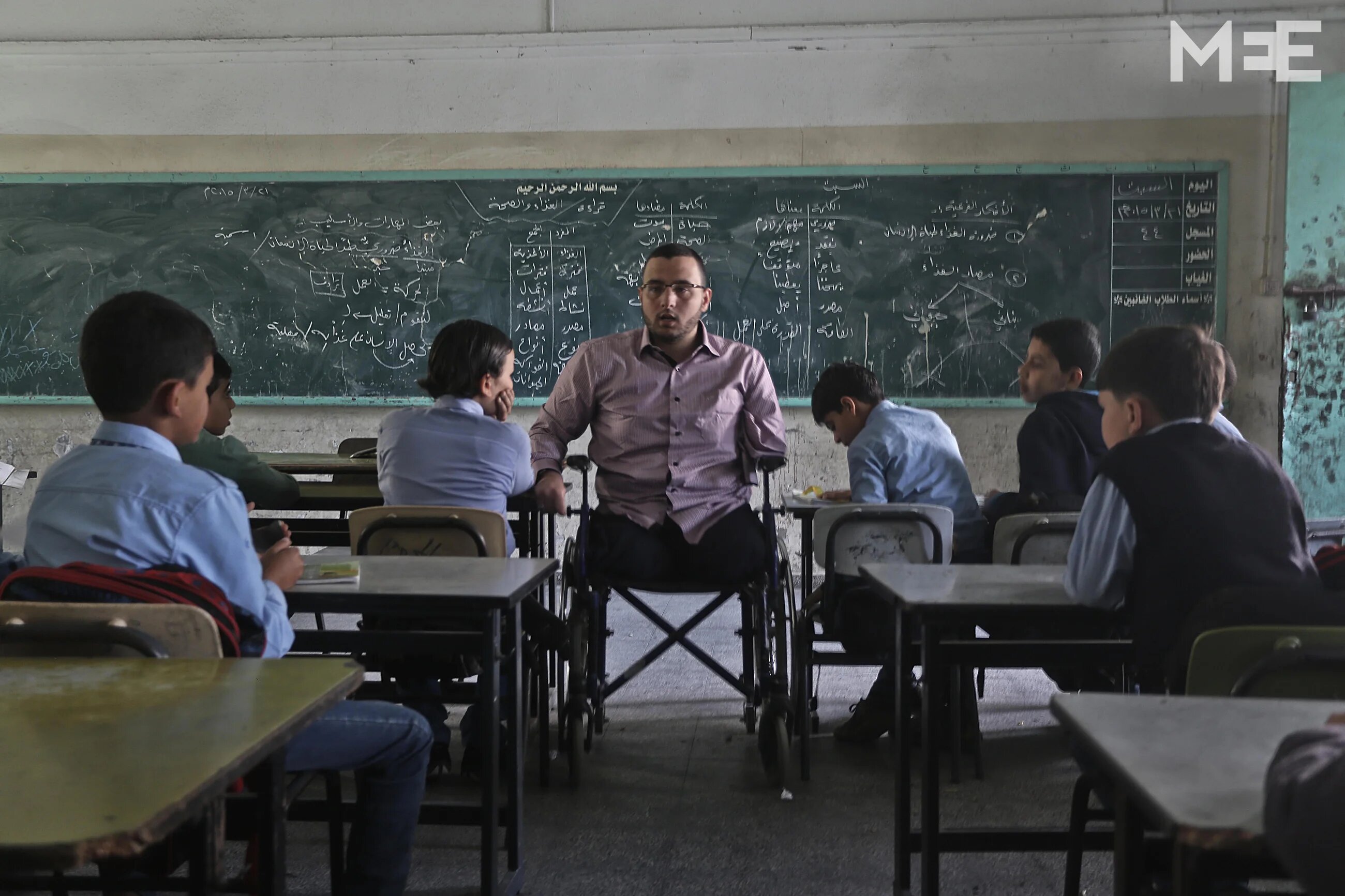 Eight-year-old Amjad Tafesh stands in front of his teacher and whispers shyly, “I am very proud of you, and I look up to you Mr. Ahmed.” He boasts proudly to MEE that his teacher is still strong despite his pain and difficulties.