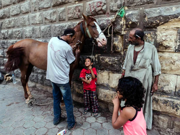 While Mohamed is busy clipping a horse's coat, his five-year-old son, Mostafa, enthusiastically helps out. "No school, what will he do after he graduates? Nothing. But with me here he will learn something where he can earn money and also it's our family's profession. What is better than taking care of animals and your family," he says while grooming a horse.