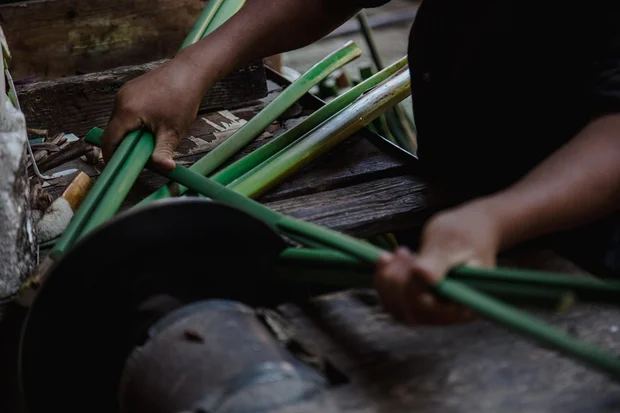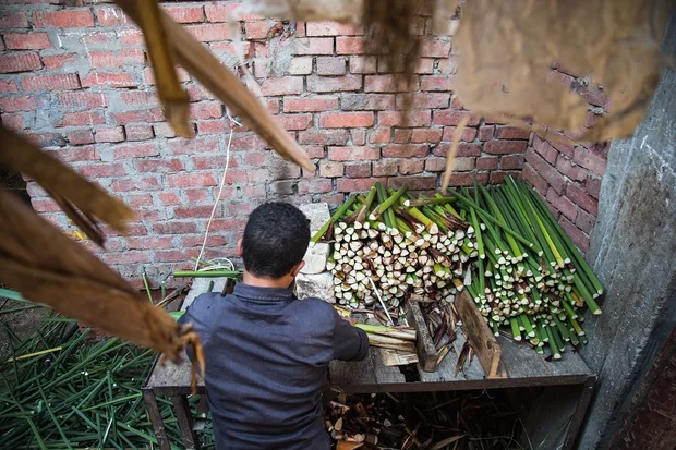 After the papyrus stems are harvested, they are cut into pieces before the outside green layer is flaked (MEE/Mohamed Osam)