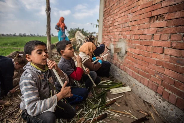 Children remove the green layer of the papyrus plant using their teeth (MEE/Mohamed Osam)