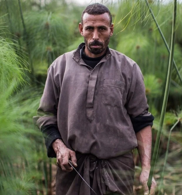 Today in al-Qaramos, a village north of Cairo in the governorate of Sharqia in the Nile Delta, men go to harvest the papyrus sedge like the ancient Egyptians did centuries ago. Women collect the harvested stems in small workshops based in their homes and they begin the process of transforming them into the final paper product.