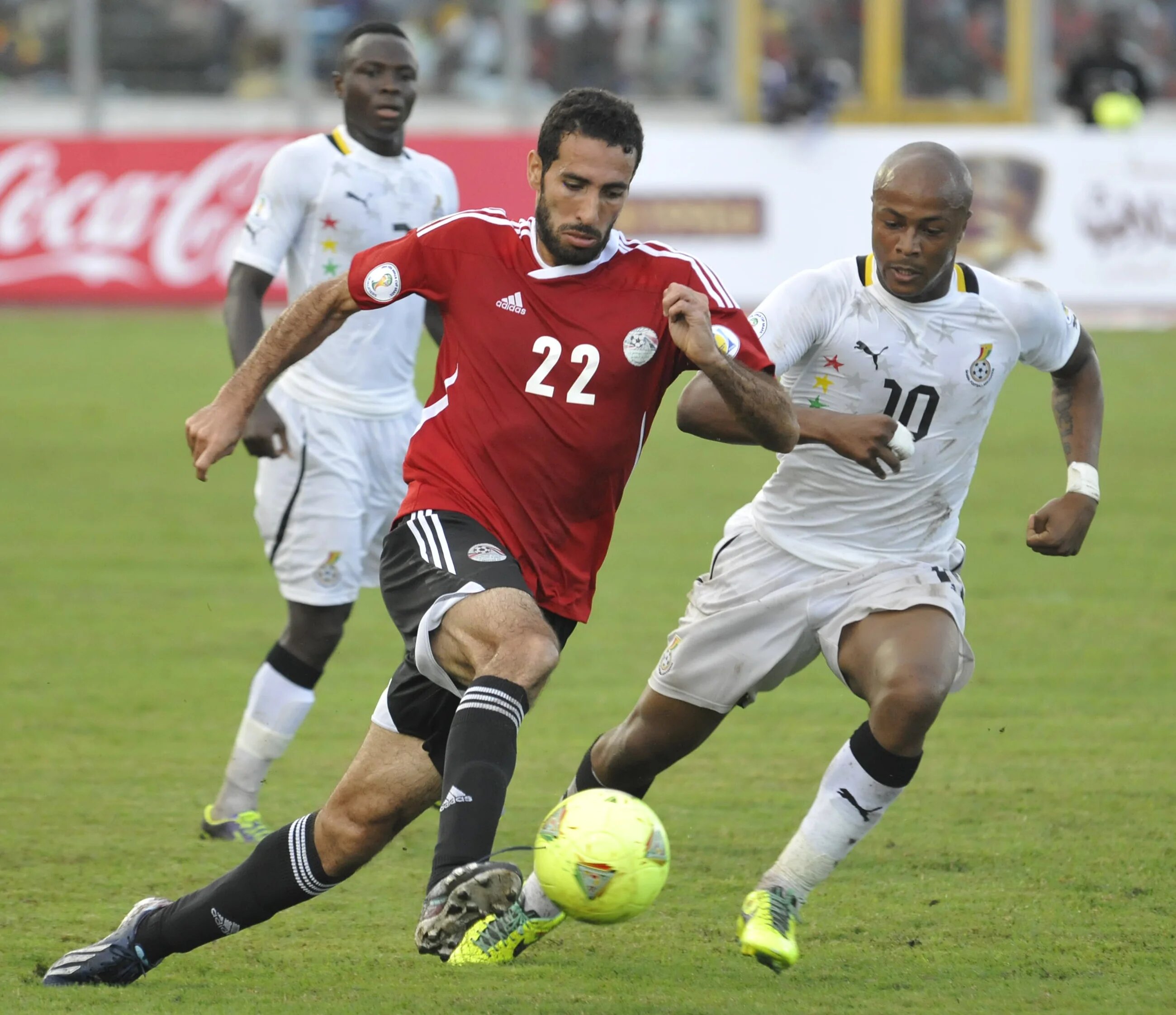 Egypt's Mohamed Aboutrika (L) vies with Ghana's Andre Ayew (R) during the Fifa World Cup 2014 qualifying football match Ghana vs Egypt, on October 16, 2013 at Baba Yara stadium in Kumasi. (AFP)