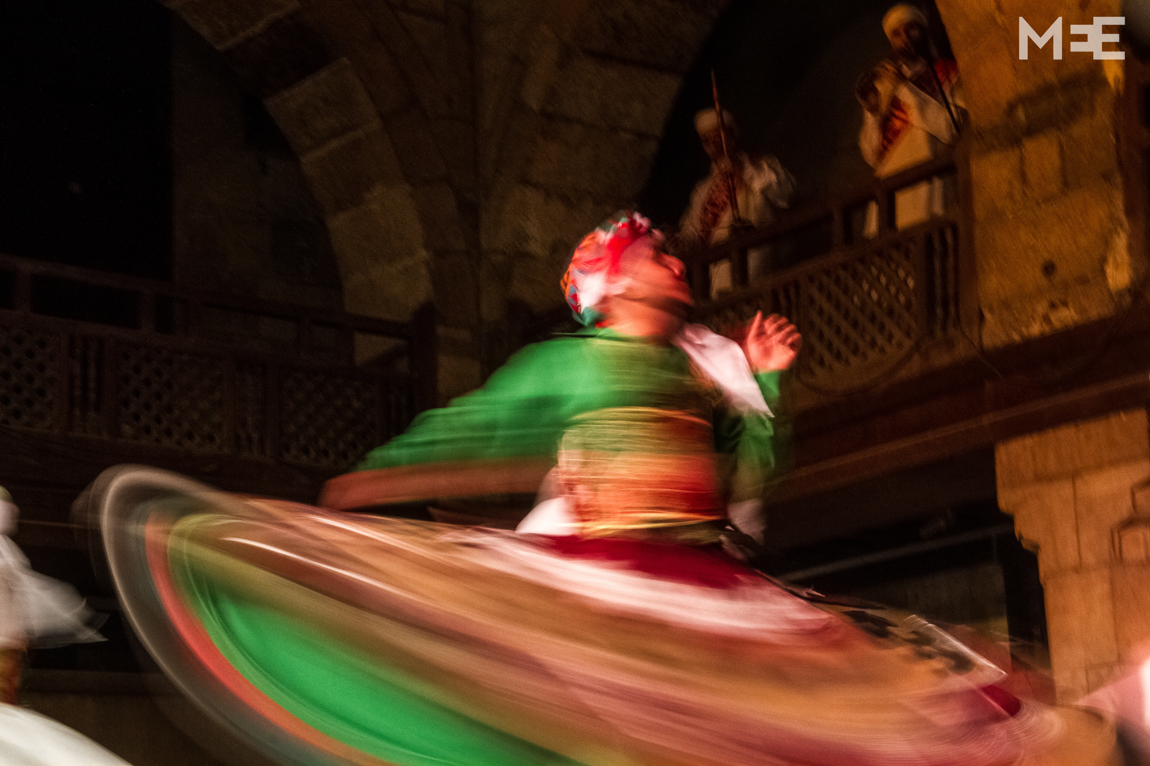 One of the Sufi dancers spins during the weekly performance in downtown Cairo (MEE/Belal Darder)