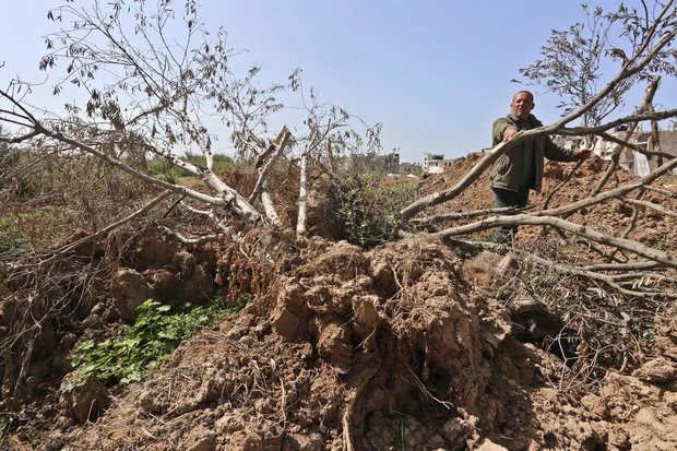 Not far from here stands Abu Baker al-Batniji, amid the ruins of his farmland. As he holds up branches of olive trees uprooted by Israel’s army, he remembers how he used to own “700 beautiful olive and citrus trees”.