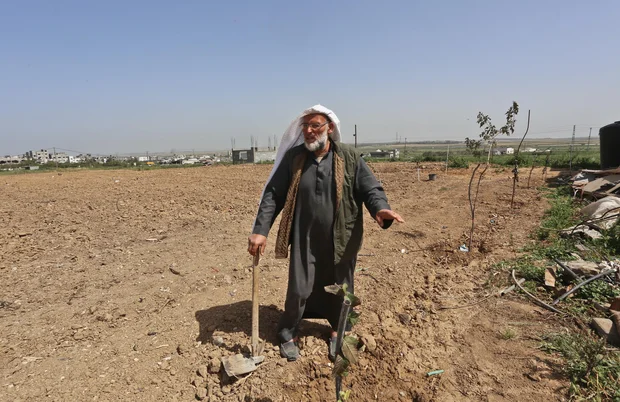 Mohammed al-Arraier stands on 20 dunums of land that he leases, close to Israel’s military buffer zone where Israeli soldiers have shot at agricultural workers before, in what is considered to be one of the most dangerous areas.