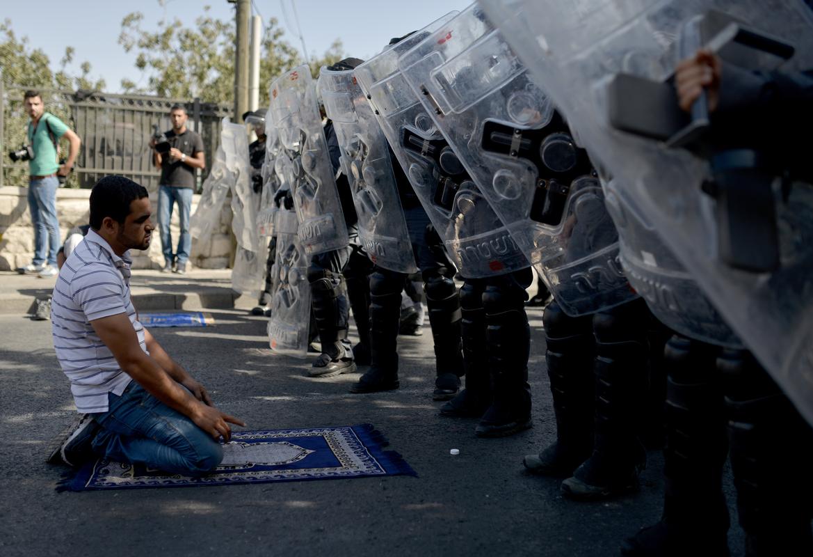 Mohammed Mansour, a 31 year-old resident of Gaza, showed a photograph of a young Palestinian woman being used as a human shield at the mosque. In the picture, a member of Israel's military holds her neck against his chest while using her as a prop to point his gun at protestors at the compound in Jerusalem.