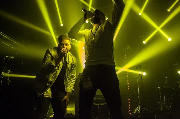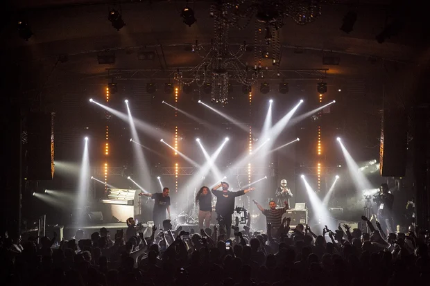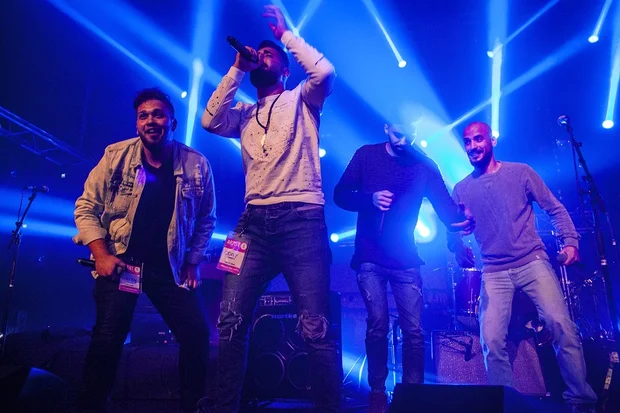 The four MCs in the band perform in front of a crowd of young Palestinians who have travelled from around the West Bank and cities within Israel such as Haifa to see the group play live at the Palestine Music Expo (PMX).