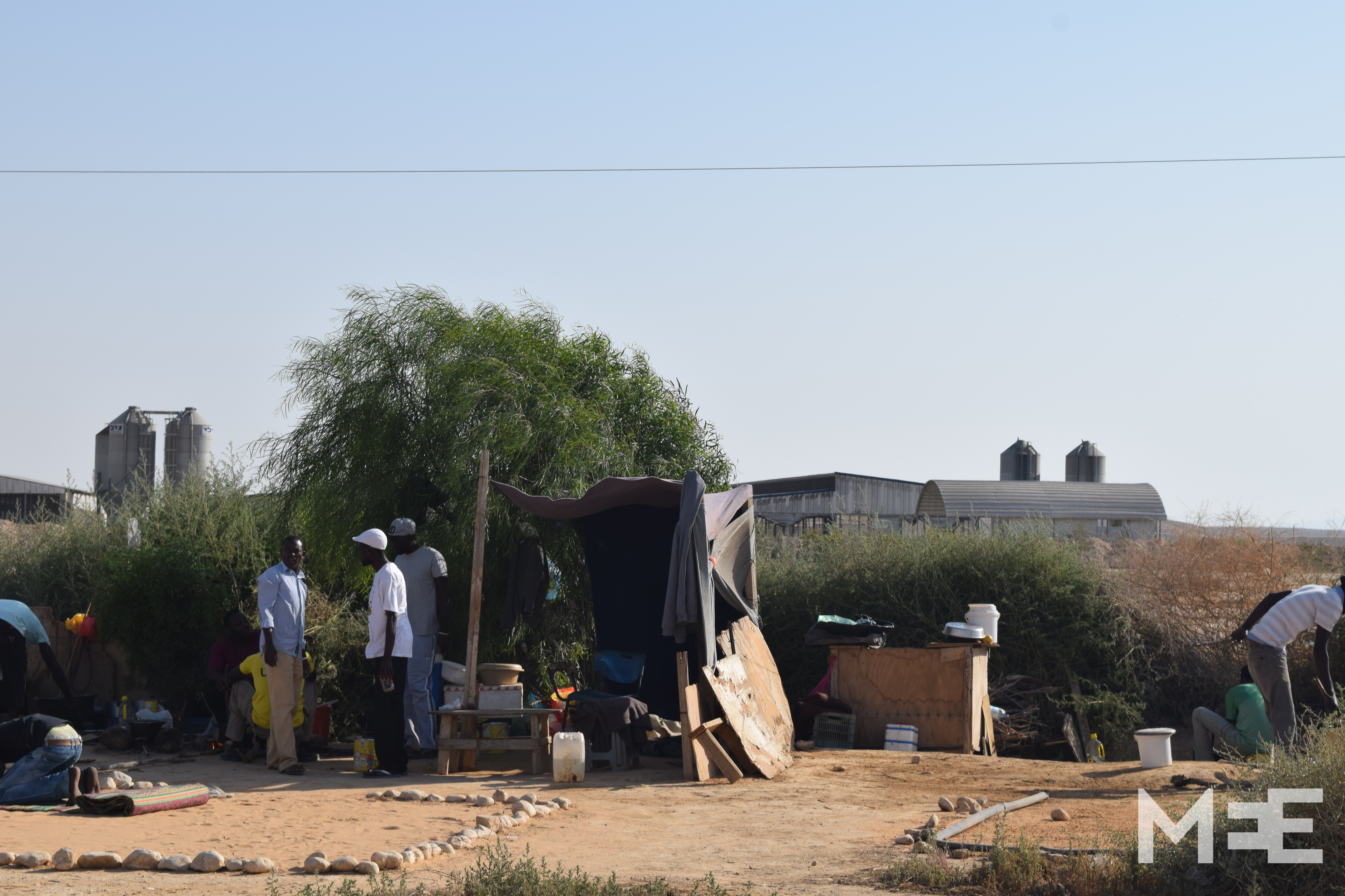 The desert wind hits the men’s faces as they gather in the late afternoon sun at the Holot Detention Centre.