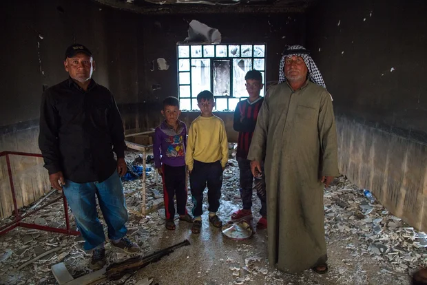 When Moqdad Hassan Ismaeil al-Barghout opens the gate outside of his partially burned-down concrete home, the security guard standing outside the gate relaxes as he comes out to greet us.